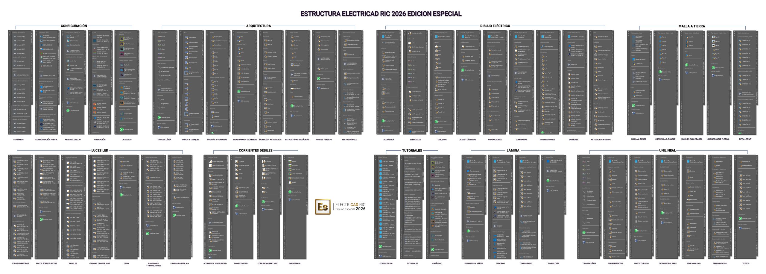 Las funciones integradas en ElectriCAD RIC 2026 EDICIÓN ESPECIAL, están diseñadas para automatizar y simplificar el proceso de dibujo eléctrico en AutoCAD. Estas funciones permiten, entre otras, el reconocimiento automático de artefactos en los circuitos de cuadros de carga (luminarias y enchufes), la consulta rápida de la potencia instalada (en Watts) y la cubicación precisa de conductores y ductos, incluyendo bajadas y subidas. Conteo de artefactos usados, chequeo de enlace (golpe de corriente), etc.También integran funciones matemáticas avanzadas, que pueden utilizarse directamente con los textos del dibujo, Busqueda dinámica de elementos en toda la libería. Entre otras funciones, destacan la repartición de elementos en área, tramo o línea, y la interacción con la norma RIC desde la misma librería. Además, permite el acceso a videos tutoriales integrados, agilizando todo el proceso de aprendizaje, práctica y dibujo, optimizando así, el flujo de trabajo en tus proyectos eléctricos.
